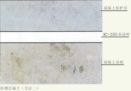 方法二:在混凝土基面上涂刷1.5~2mmKC-JS聚合物防水涂料。適用范圍廣,在一些有障礙物或基面不平整地面均可使用。然后再做保護層。